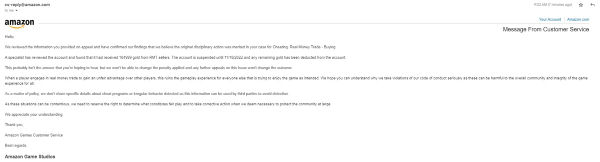 The only report which I read and had valid info about it, had way more info and full message from support with dates and all that stuff because of all the misinformation these forums spread. In fact, their “RMT” claim also took in count the market tax for selling an item which is deducted when the item is sold.